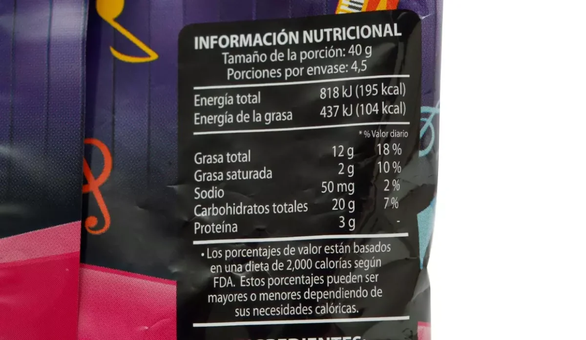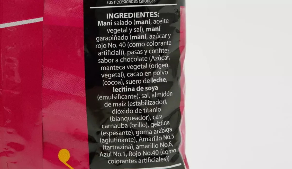 | Ingredientes | Maní salado (maní, aceite vegetal y sal), mani garapiñado (maní, azúcar y rojo No. 40 (como colorante artificial)), pasas y confites sabor a chocolate (Azúcar, manteca vegetal (origen vegetal), cacao en polvo (cocoa), suero de leche, lecitina de soya (emulsificante), sal, almidón de maíz (estabilizador), dióxido de titanio (blanqueador), cera carnauba (brillo), gelatina (espesante), goma arábiga (aglutinante), Amarillo No.5 (tartrazina), amarillo No.6, Azul No.1, Rojo No.40 (como colorantes arti |