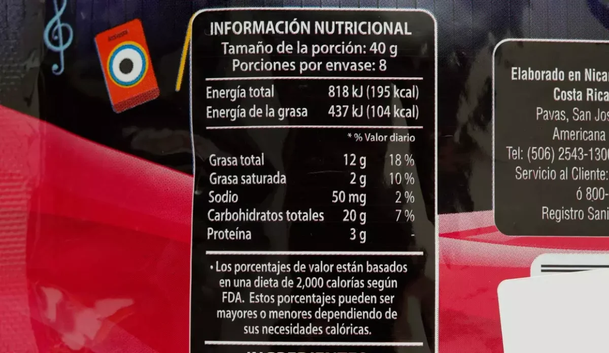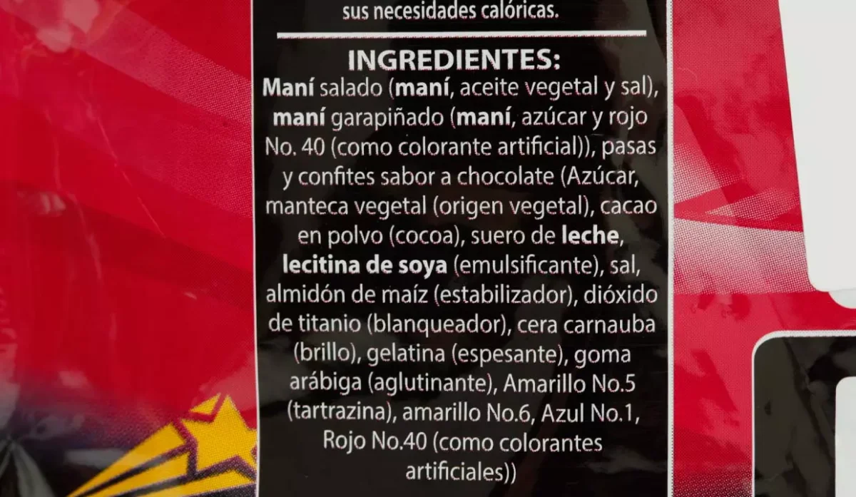 | Ingredientes | Maní salado (maní, aceite vegetal y sal), maní garapiñado (maní, azúcar y rojo No. 40 (como colorante artificial)), pasas y confites sabor a chocolate (Azúcar, manteca vegetal (origen vegetal), cacao en polvo (cocoa), suero de leche, lecitina de soya (emulsificante), sal, almidón de maíz (estabilizador), dióxido de titanio (blanqueador), cera carnauba (brillo), gelatina (espesante), goma arábiga (aglutinante), amarillo No.5 (tartrazina), amarillo No.6, azul No.1, rojo No.40 |