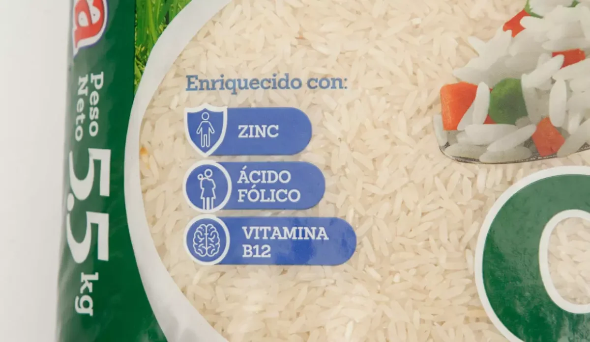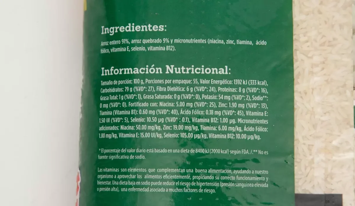 | Ingredientes | Arroz entero 91% y micronutrientes (niacina, zinc, tiamina, ácido fólico, vitamina E, selenio y vitamina B12) |