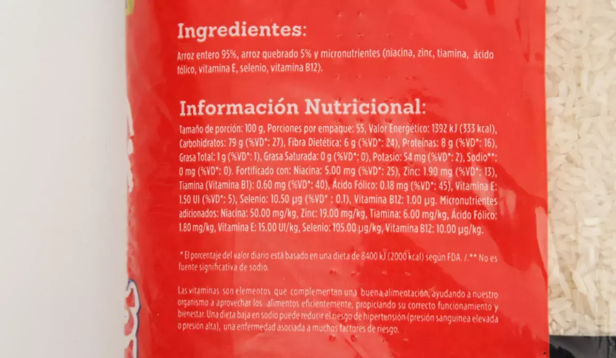 | Ingredientes | Arroz entero 95% y micronutrientes (niacina, zinc, tiamina, ácido fólico, vitamina E, selenio y vitamina B12) |