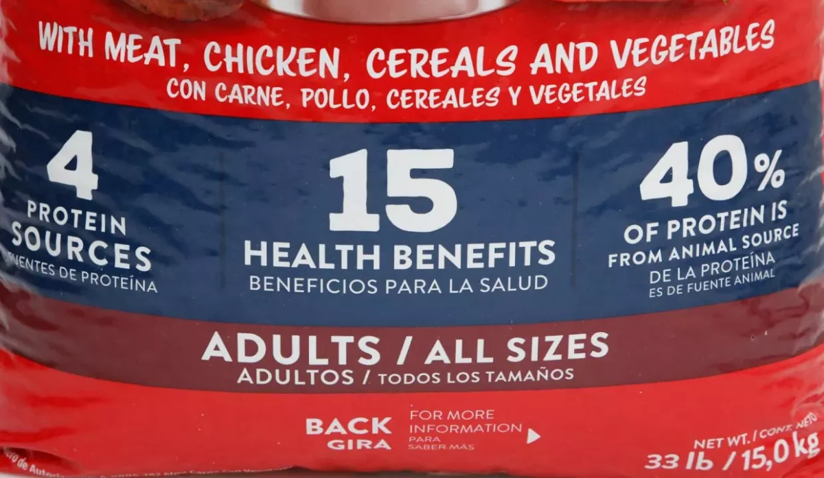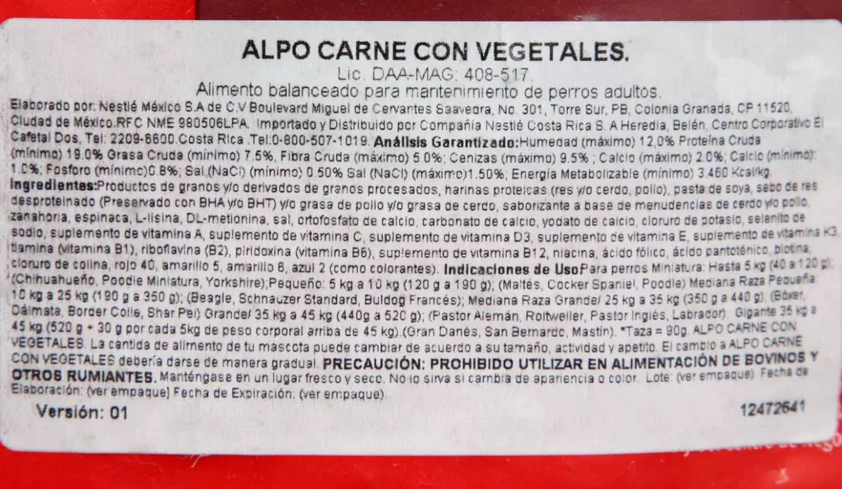 | Ingredientes | Productos de granos y/o derivados de granos procesados, harina proteicas (res, cerdo y pollo), pasta de soya, sebo de res desproteinado, grasa de pollo, grasa de cerdo, saborizante a base de menudencias de cerdo y/o pollo, zanahoria, espinaca, L lisina, DL metionina, sal, ortofosfato de calcio, carbonato de calcio, yodato de calcio, cloruro de potasio, selenito de sodio, suplemento de vitaminas A, C, D, E, K3, tiamina, riboflavina, piridoxina, suplemento de vitamina B12, niacina, ácido fólico |