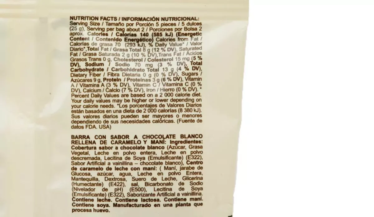 | Sabor | Chocolate blanco con relleno de caramelo y maní |