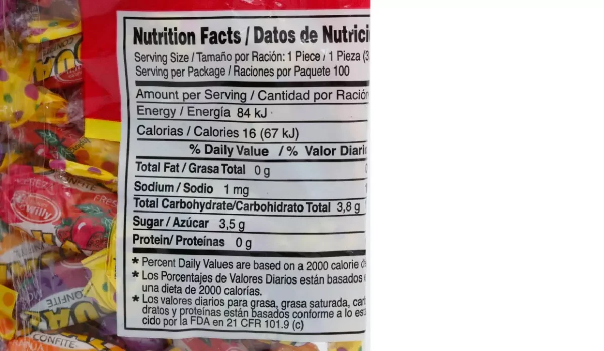 | Ingredientes | Azúcar, glucosa, ácido cítrico, sabores artificiales a piña, naranja, fresa, cereza, uva y mora, colores artificiales amarillo #5 y #6, rojo #40, azul #2, glicerina y dióxido de titaneo |