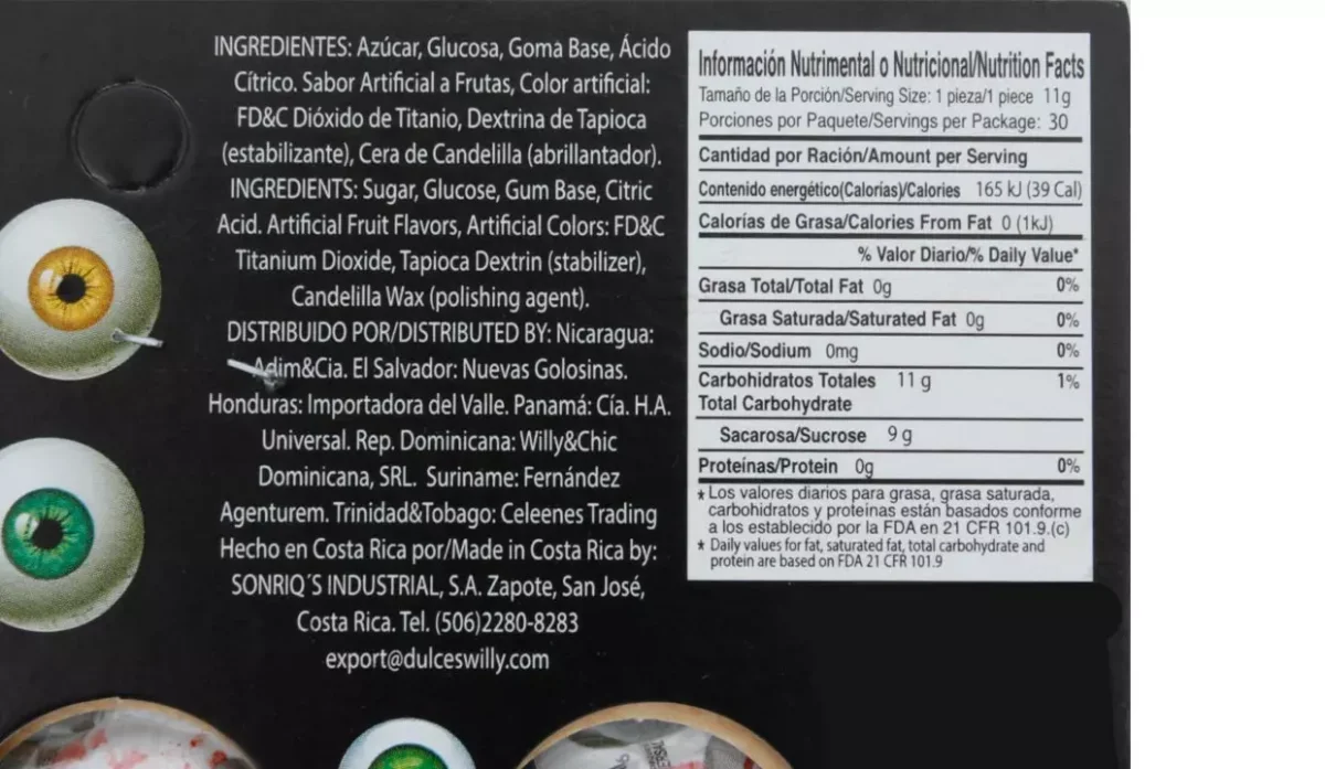 | Ingredientes | Azúcar, glucosa, goma base, ácido cítrico, sabor artificial a frutas, color artificial, dióxido de titanio, destrina de tapioca, cera de candelilla |