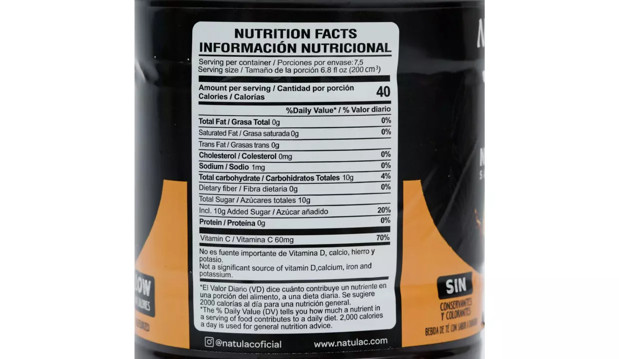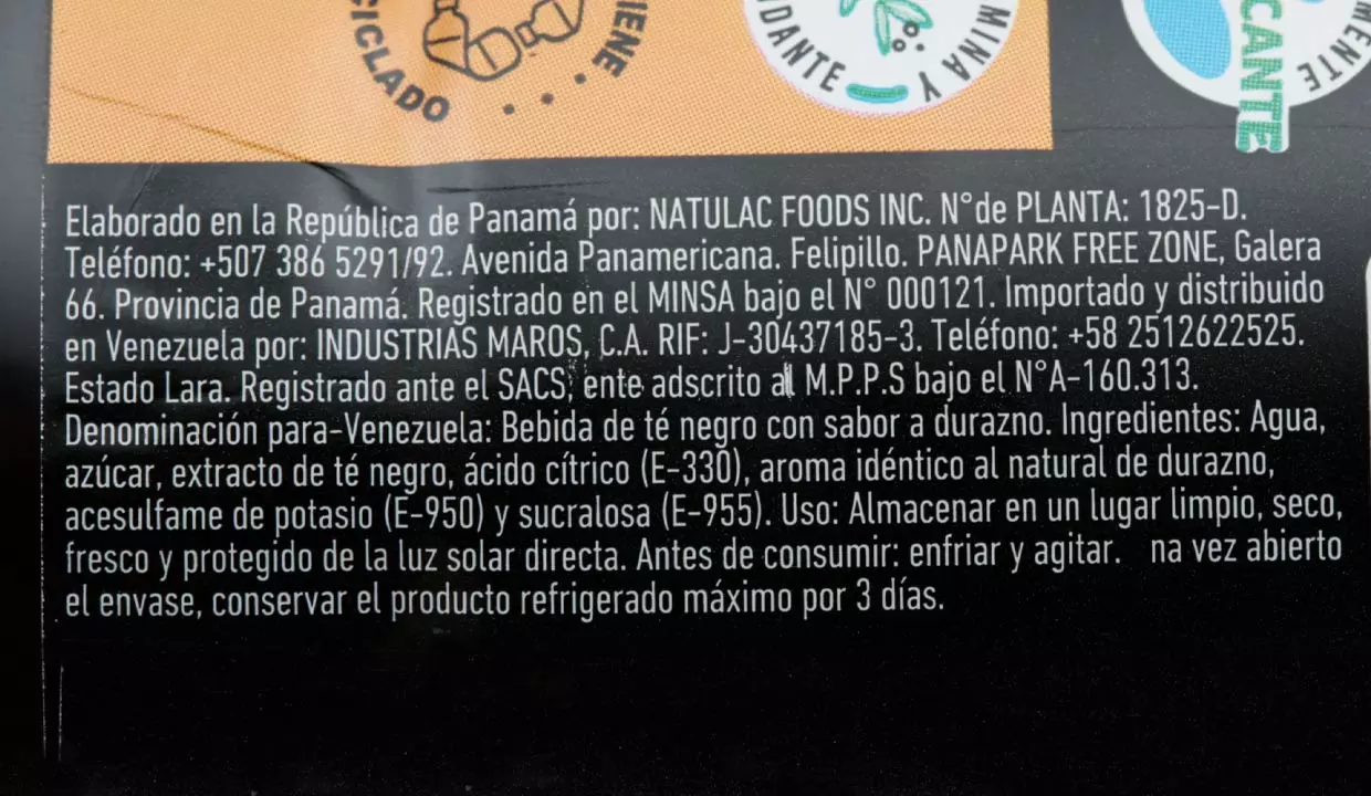| Ingredientes | Agua, azúcar, extracto de té negro, ácido cítrico, aroma idéntico al natural de durazno, acesulfame de potasio, sulcralosa |