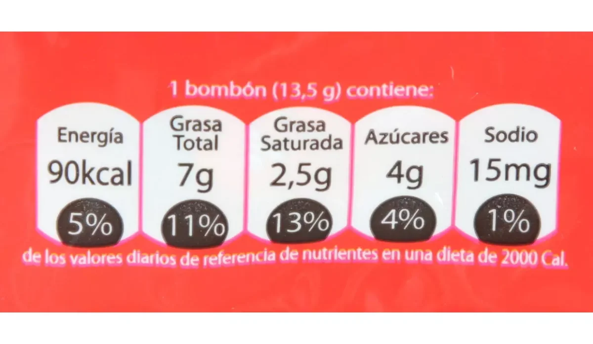 | Ingredientes | Relleno de caramelo suave derretido (jarabe de glucosa, azúcar, grasa vegetal, leche entera en polvo, humectante (sorbitol), emulsionante (lecitina de soja), sal, regulador de la acidez (carbonato de sodio) y sabor natural (crema de caramelo)) |