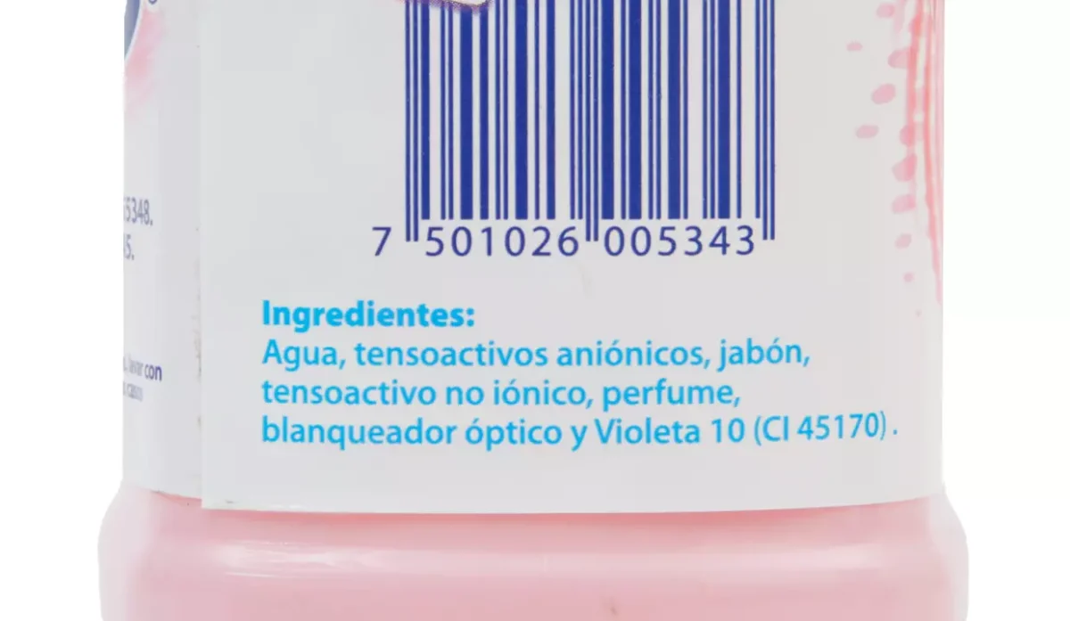 | Ingredientes | Agua tensoactivos aniónicos, jabón, tensoactivo no iónico, perfume, blanqueador óptimo y violeta 10 |