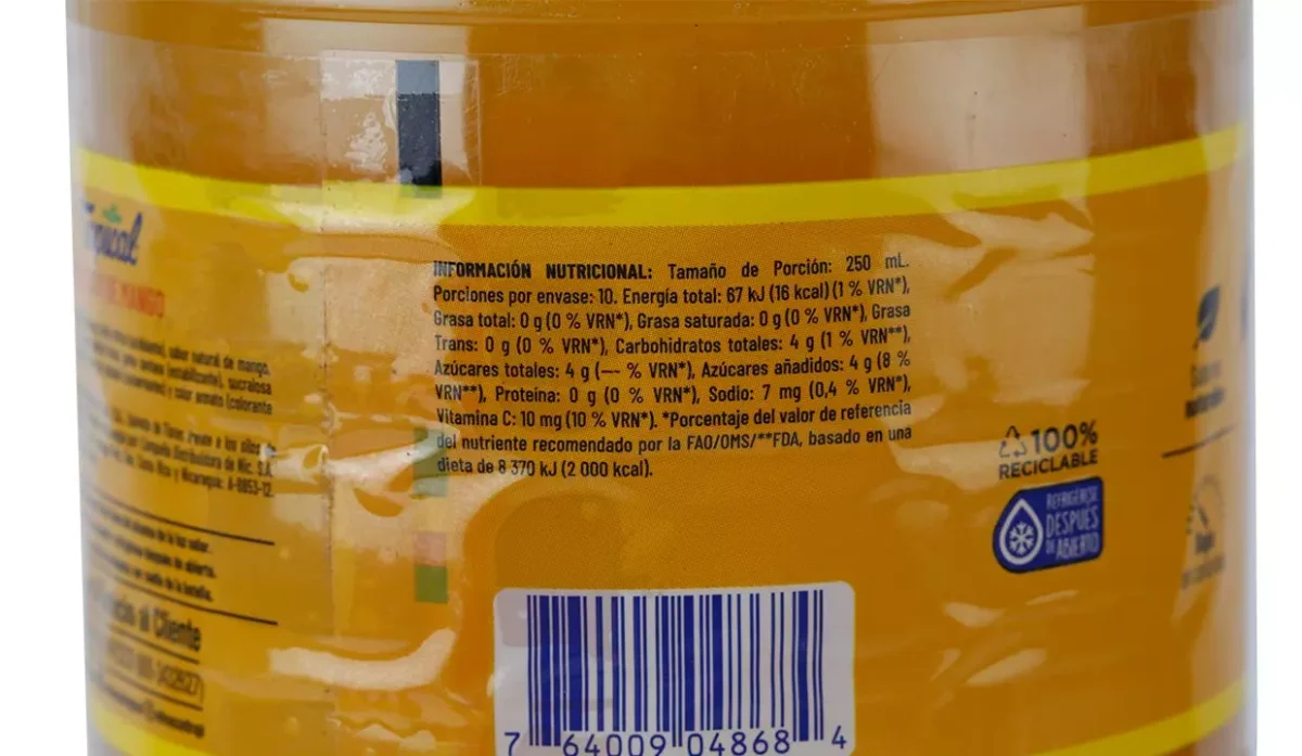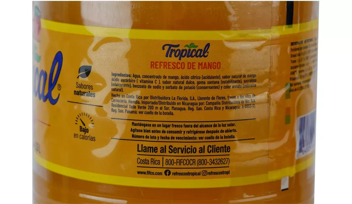| Ingredientes | Agua, concentrado de mango, azúcar, ácido cítrico, como acidulante, sucralosa como edulcorante, benzoato de sodio y sorbato de potasio como conservantes, color annato colorante natural |