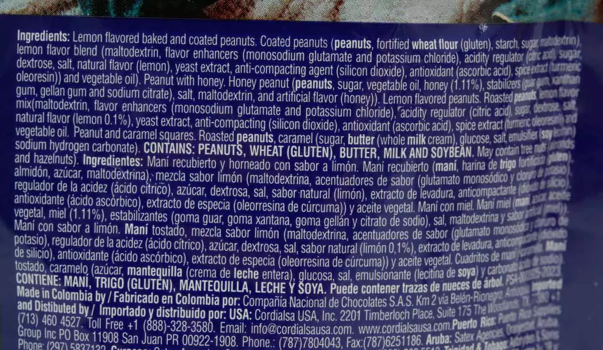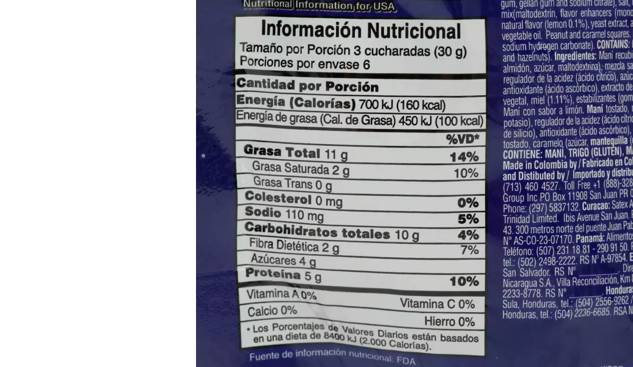 | Características | Maní recubierto y horneado con sabor a limón, maní con miel, maní con sabor a limón, cuadritos de maní y caramelo |