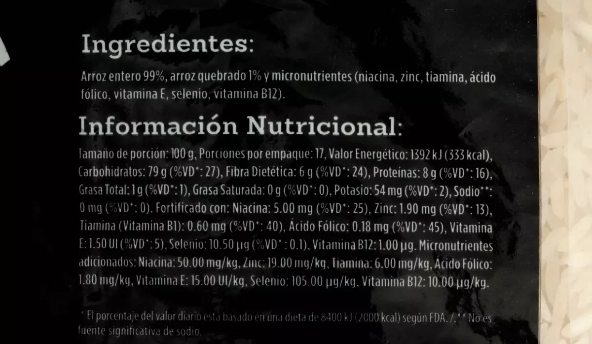 | Ingredientes | Arroz entero 99%, arroz quebrado 1% y micronutrientes. niacina, zinc, tiamina, ácido fólico, vitamina E, selenio y vitamina B12 |