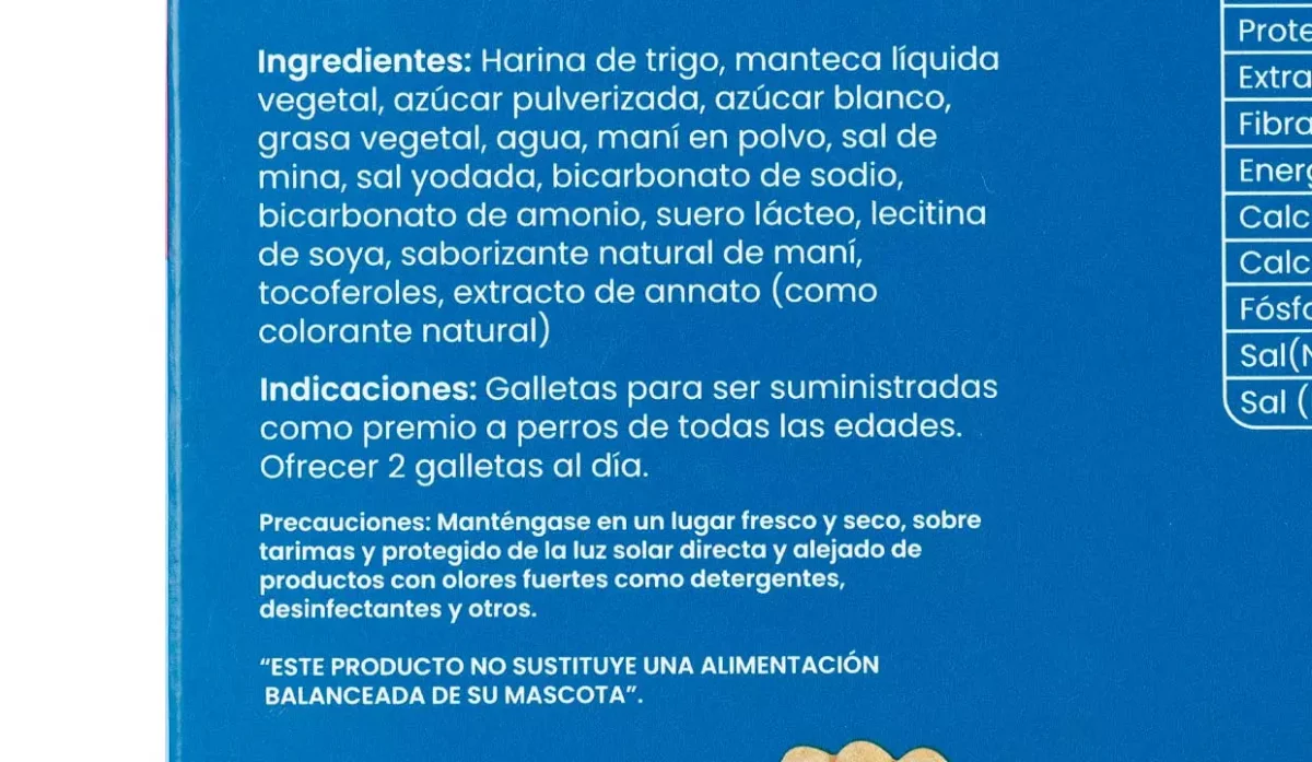 | Ingredientes | Harina de trigo, manteca líquida vegetal, azúcar pulverizada, azúcar blanco, grasa vegetal, agua, maní en polvo, sal de mina, sal yodada, bicarbonato de sodio, bicarbonato de amonio, suero lácteo, lecitina de soya, saborizante natural de maní, tocoferoles, extracto de annato (como colorante natural) |