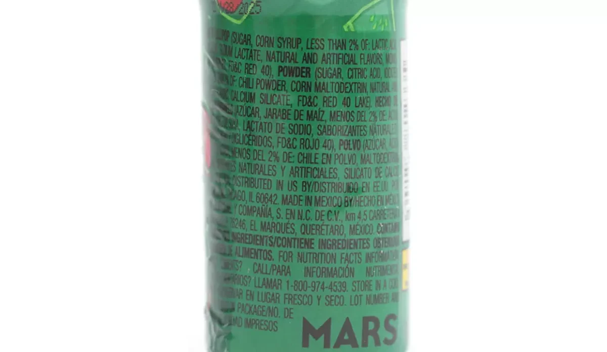 | Ingredientes | Paleta de caramelo, azúcar, jarabe de maíz, ácido láctico, aceite de soya, lactato de sodio, saborizantes naturales y artificiales, mono y glicéridos, sal yodada, chile en polvo, maltodesxtrina de maíz, silicato de calcio |