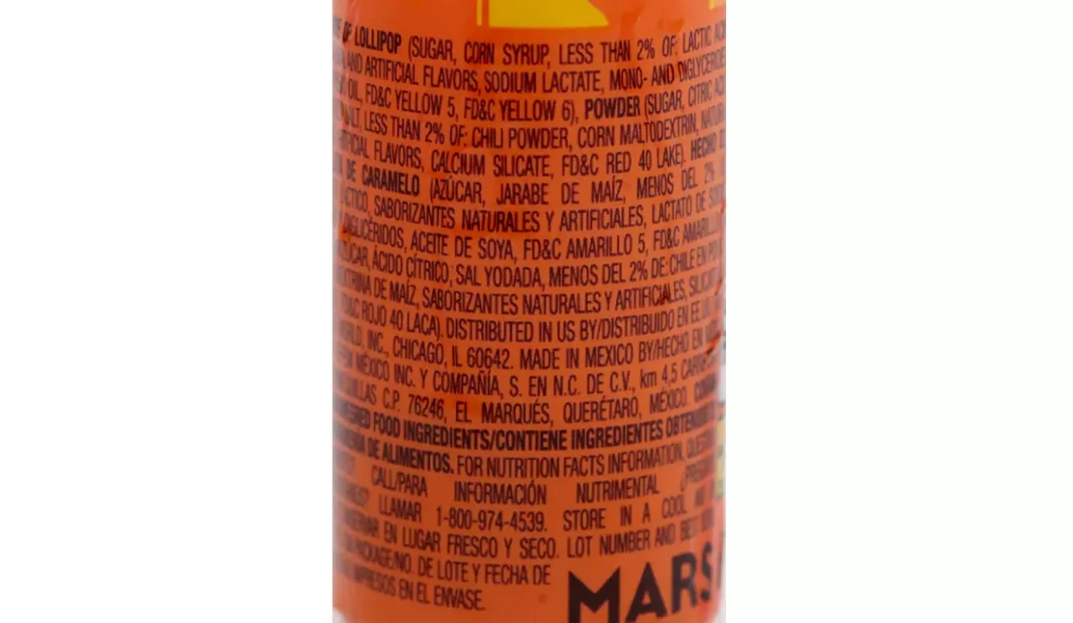 | Ingredientes | Paleta de caramelo, azúcar, jarabe de maíz, ácido láctico, saborizantes naturales y artificiales, lactato de sodio, mono y glicéridos, aceite de soya, ácido cítrico, sal yodada, chile en polvo, maltodextrina de maíz, silicato de calcio |