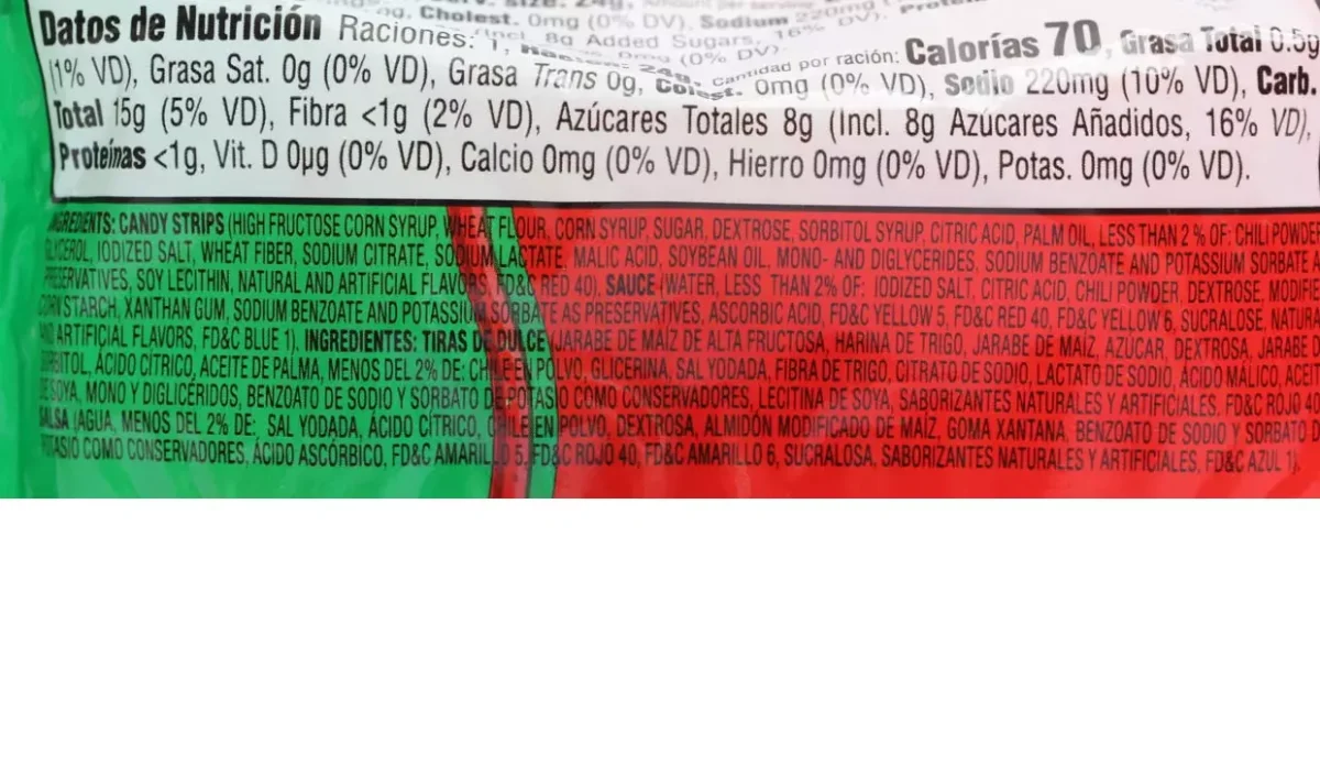 | Ingredientes | Tiras de dulce, jarabe de maíz de alta fruxtosa, harina de trigo, jarabe de maíz azúcar, dextrosa, jarabe de sorbitol, ácido cítrico, aceite de palma, chile en polvo, glicerina, sal yodada, fibra de trigo, citrato de sodio, lactato de sodio, ácido málico, aceite de soya, mono y diglicéridos, benzoato de sodio y sorbato de potasio, lecitina de soya, saborizantes naturales y artificiales |