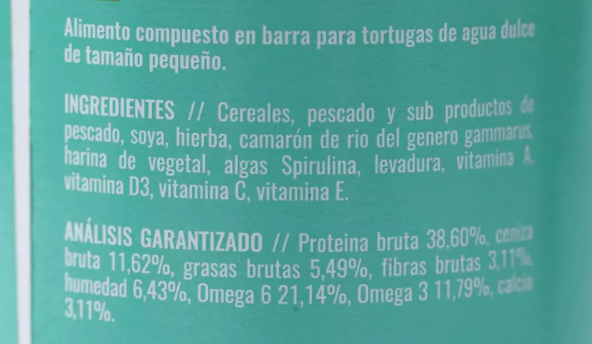 | Ingredientes | Cereales, pescado y sub productos de pescado, soya, hierba, camarón de río del género gammarus, harina de vegetal, algas spirulina, levadura, vitamina A, vitamina D3, vitamina C, vitamina E |