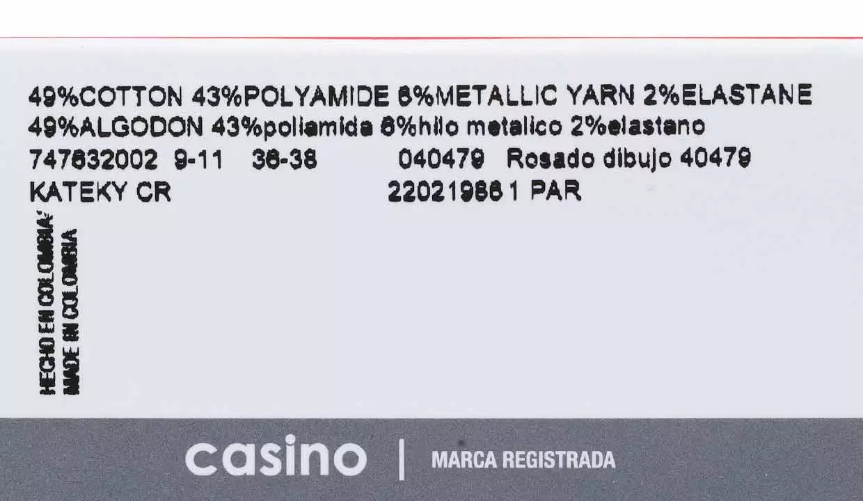 Material | 49% algodón, 43% poliamida. 6% hilo metálico, 2% elastano |