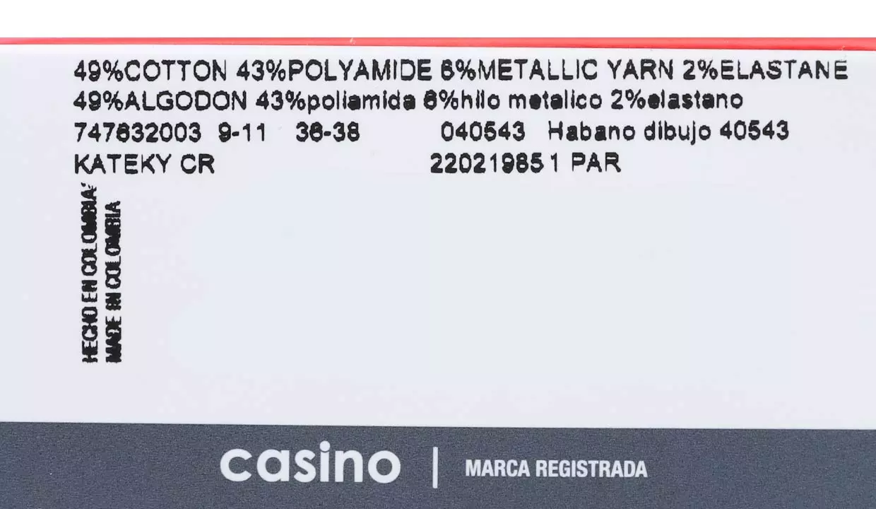 Material | 49% algodón, 43% poliamida, 6% hilo metálico, 2% elastano |