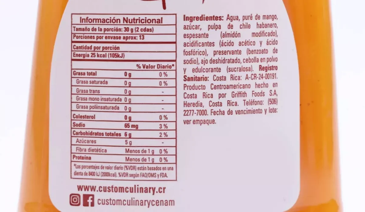 | Ingredientes | Agua, puré de mango, azúcar, pulpa de chile habanero, espesante (almidón modificado), acidificantes (ácido acético, ácido fosfórico), preservante (benzoato de sodio), ajo deshidratado, cebolla en polvo y edulcorante (sucralosa) |