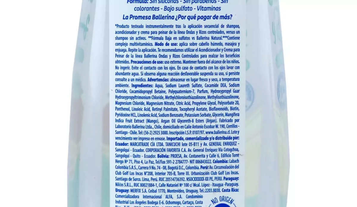 | Ingredientes | Agua, lauril éter sulfato de sodio, cocamida, cloruro de sodio, cocamidopropil betaína, policuaternio, perfume, hidroxipropil guar, cloruro de hidroxipropiltrimonio, metilcloroisotiazilinona, metilisotiazolinona, cloruro de magnesio, nitrato de magnesio, ácido cítrico, propilenglicol, polisorbato, parabenol, ácido linoleico, palmitato de retinilo, acetato de tocoferilo, bioflavonoides, biotina, extracto de fruta (mango), aceite de argán |