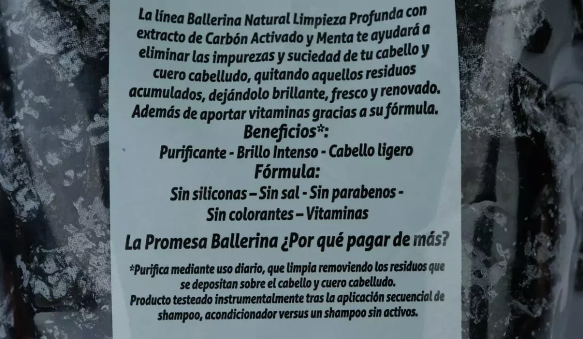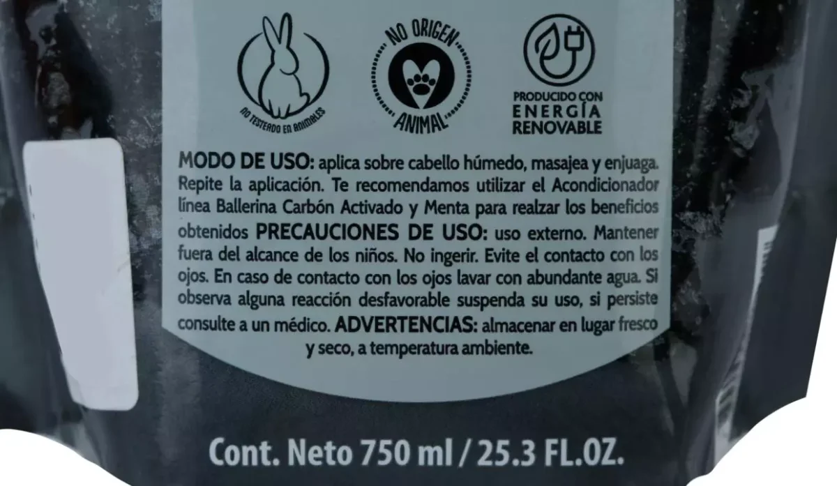 | Ingredientes | Agua, sulfato de sodio, cocamidopropil betaína, cocamida, policuaternio, triloato de metil glucosa, propilenglicol, sodio, sulfonato de olefina, perfume, metilcloroiso tiazolinona, metiliso tiasolina, cloruro de magnesio, nitrato de magnesio, ácido cítrico, polvo de carbón, poliglicerilo, estearato, miristato, poliglicerina, deshidroacetato de sodio, menta piperita |