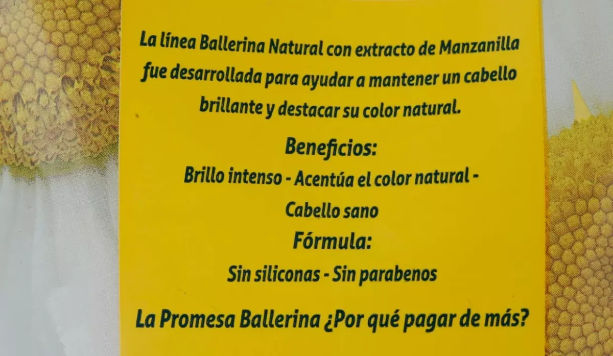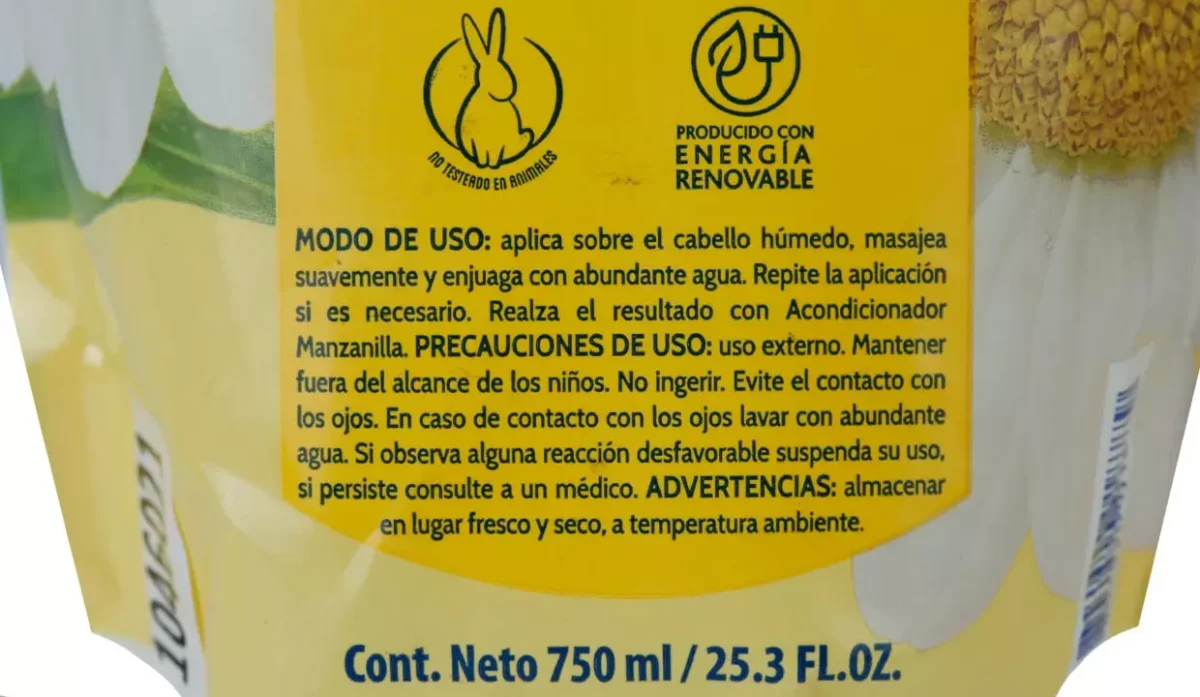 | Ingredientes | Agua, alcohol cetílico, cloruro de cetrimonio, dimeticonol, dodecilbencenosulfonato, perfume, amodimeticona, trideceth, metilcloroisotiazolinona, cloruro de metilsotiazolinona y magnesio, nitrato de magnesio, butilenglicol, extracto de Chamomilla recutita, ácido cítrico |