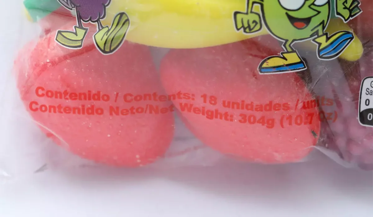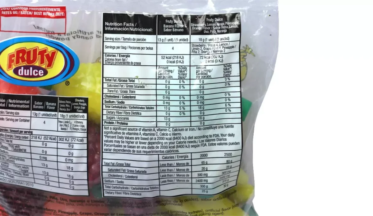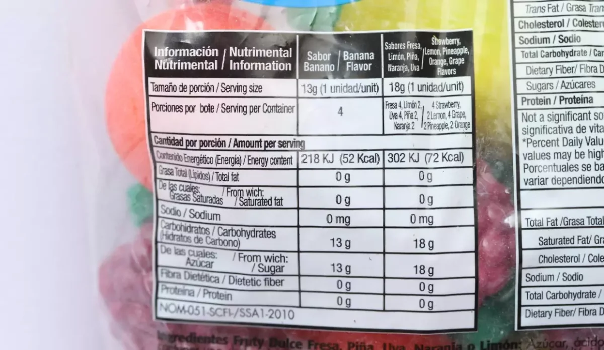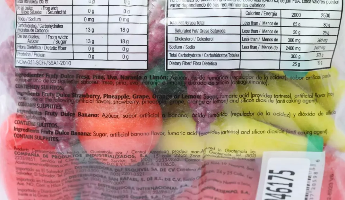 | Ingredientes | Azúcar, ácido fumárico (regulador de acidez), sabor artificial (fresa, piña, uva, naranja, o limón), dióxido de silicio (antiaglutinante) |