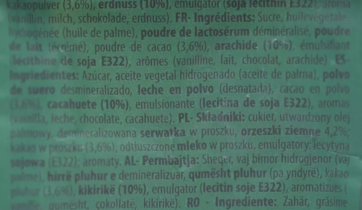 | Ingredientes | Azúcar, aceite vegetal hidrogenado (aceite de palma), polvo de suero desmineralizado, leche en polvo (desnatada), cacao en polvo, cacahuete, emulsionante (lecitina de soja), aromas (vainilla, leche, chocolate, cacahute) |