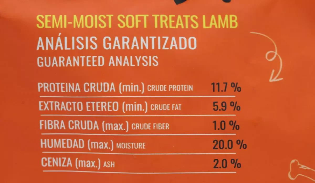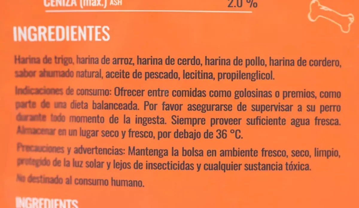 | Ingredientes | Harina de trigo, harina de arroz, harina de cerdo, harina de pollo, harina de cordero, sabor ahumado natural, aceite de pescado, lecitina, propilenglicol |