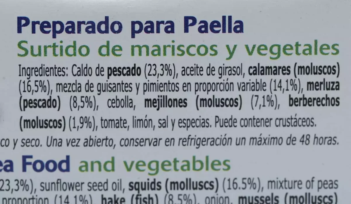 | Características | Preparado para paella, con surtido de mariscos y vegetales |