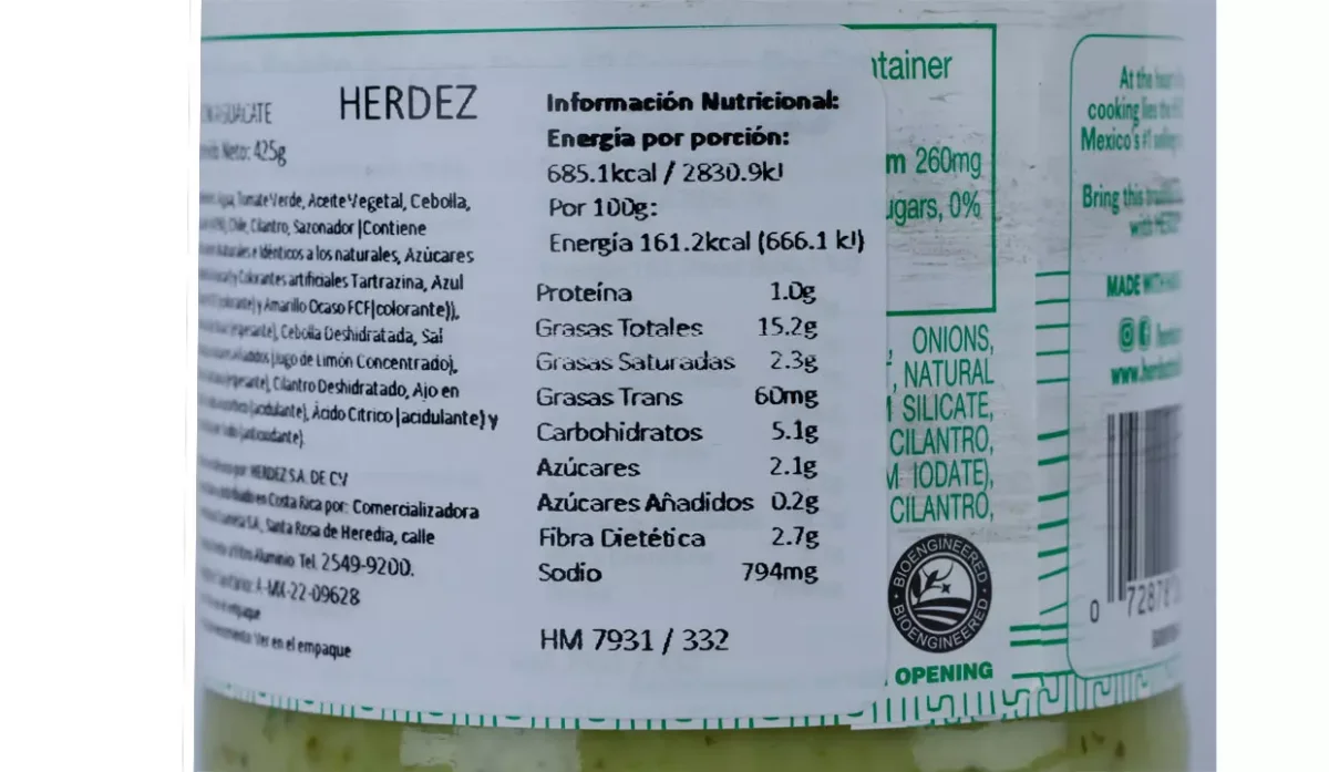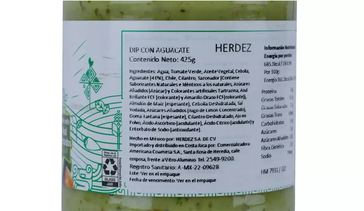 | Ingredientes | Agua, tomate verde, aceite vegetal, cebolla, aguacate (4.0%), chile, cilantro, sazonador, saborizantes naturales e idénticos a los naturales, azúcares añadidos (azúcar), colorantes artificiales, tartrazina, azul brillante, amarillo ocaso, almidón de maíz (espezante), cebolla deshidratada, sal yodada, jugo de limón concentrado, goma xantana (espezante), cilantro deshidratado, ajo en polvo, ácido ascórbico (acidulante), ácido cítrico, eritorbato de sodio (antioxidante |
