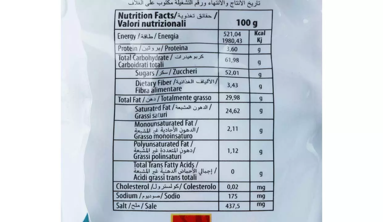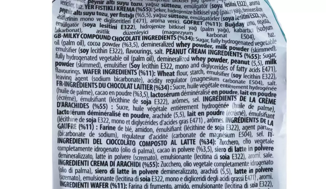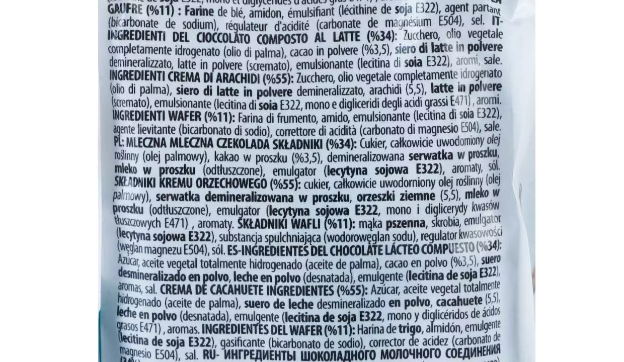 | Ingredientes | Chocolate 34%, azúcar, aceite vegetal totalmente hidrogenado (aceite de palma), cacao en polvo 3,5%, suero desmineralizado en polvo, leche en polvo (desnatada), emulgente (lecitina de soja E322), aromas, crema de maní salada 55%, mono y diglicéridos de ácidos grasos E471, aromas, oblea 11%, harina de trigo, almidón, emulgente, lecitina de soja E322, gasificante, bicarbonato de sodio, regulador de acidez, carbonato de magnesio E504 |