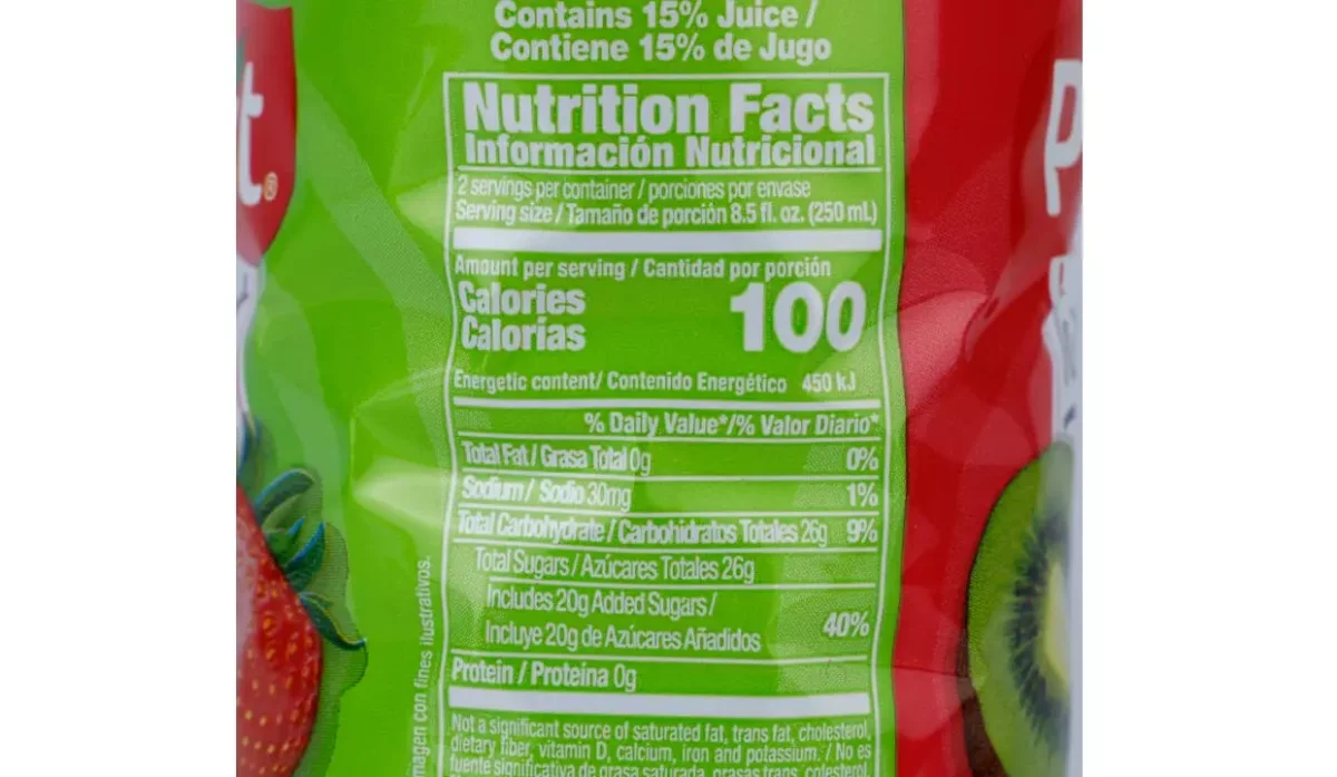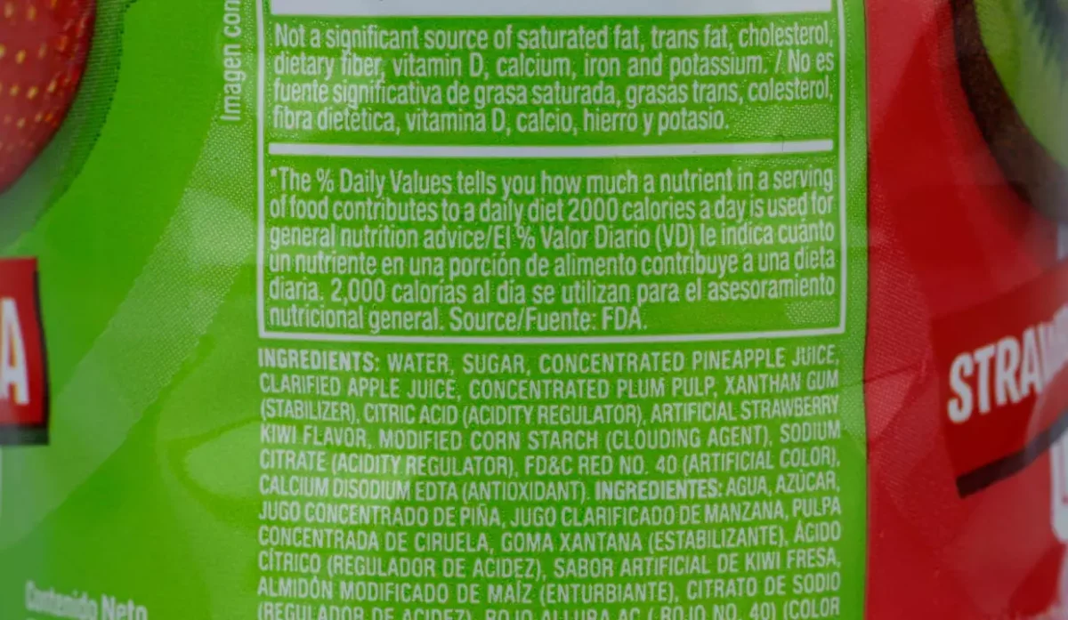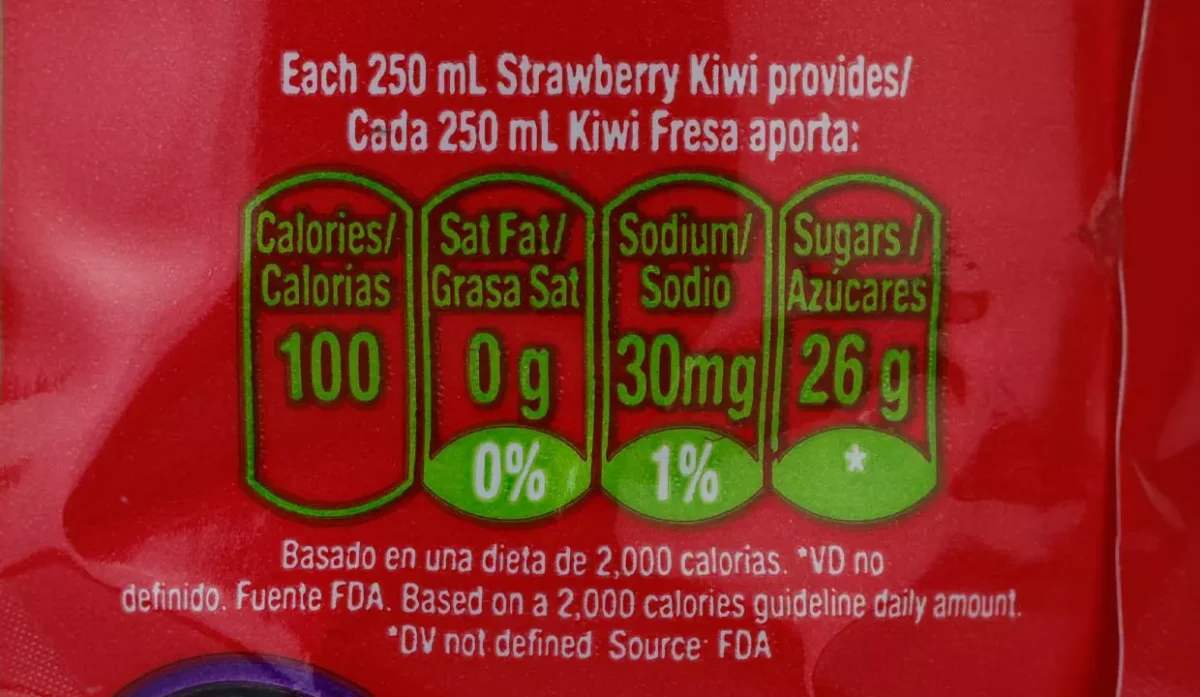 | Ingredientes | Agua, azúcar, jugo concentrado de piña, jugo clasificado de manzana, pulpa concentrada de ciruela, goma xantana (estabilizante), ácido cítrico (regulador de acidez), sabor artificial de kiwi y fresa, almidón modificado de maíz (enturbiante), citrato de sodio (regulador de acidez), rojo altura, rojo 40, color artificial, disódico cálcico (antioxidante) |