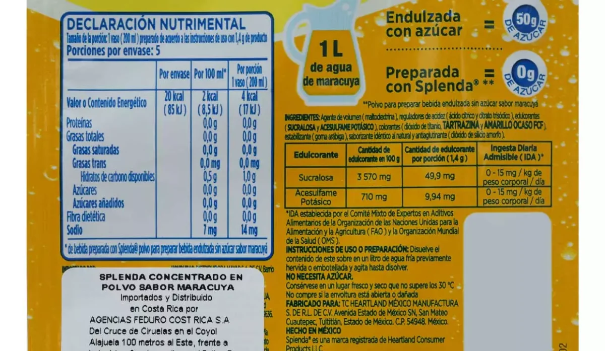 | Ingredientes | Agente de volumen (maltodextrina), reguladores de acidez (ácido cítrico y citrato trisódico), edulcorantes sucralosa, acesulfema potásico, colorantes (dióxido de titanio, tartrazina, amarillo ocaso), estabilizante (goma arábiga), saborizante idéntico al natural y antiglutinante (dióxido de silicio amorfo) |