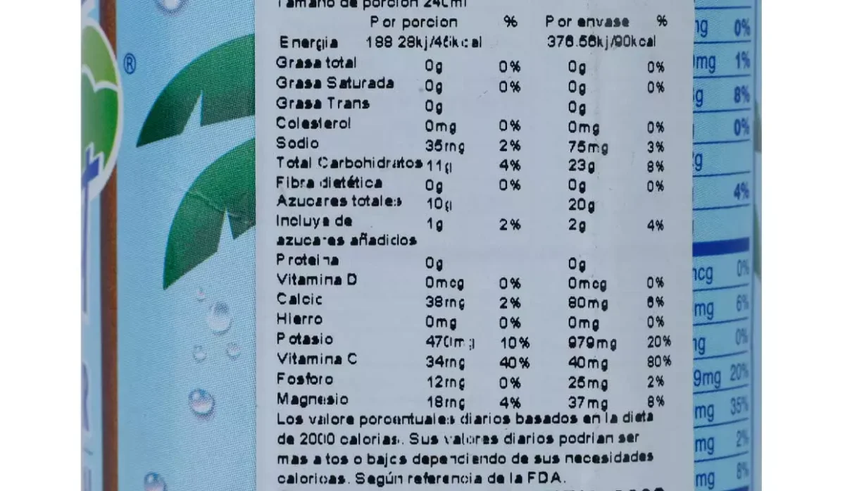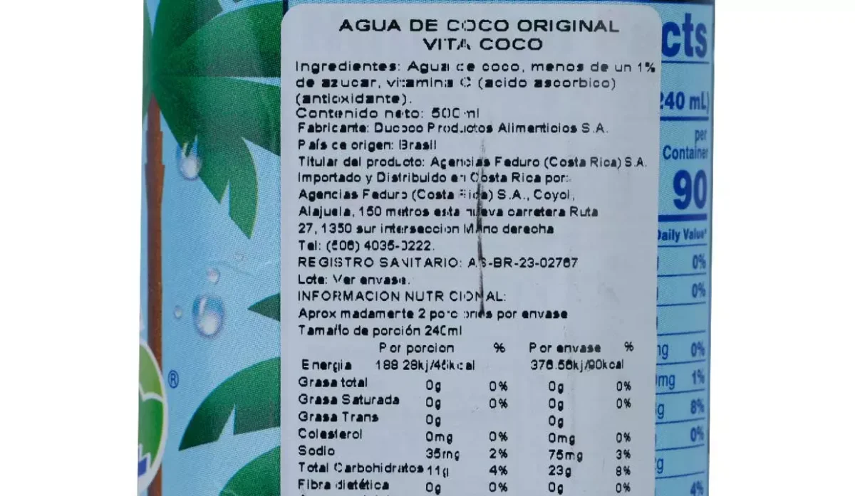 | Ingredientes | Agua de coco, menos de un 1% de azúcar, vitamina C (ácido ascórbico) antióxido |