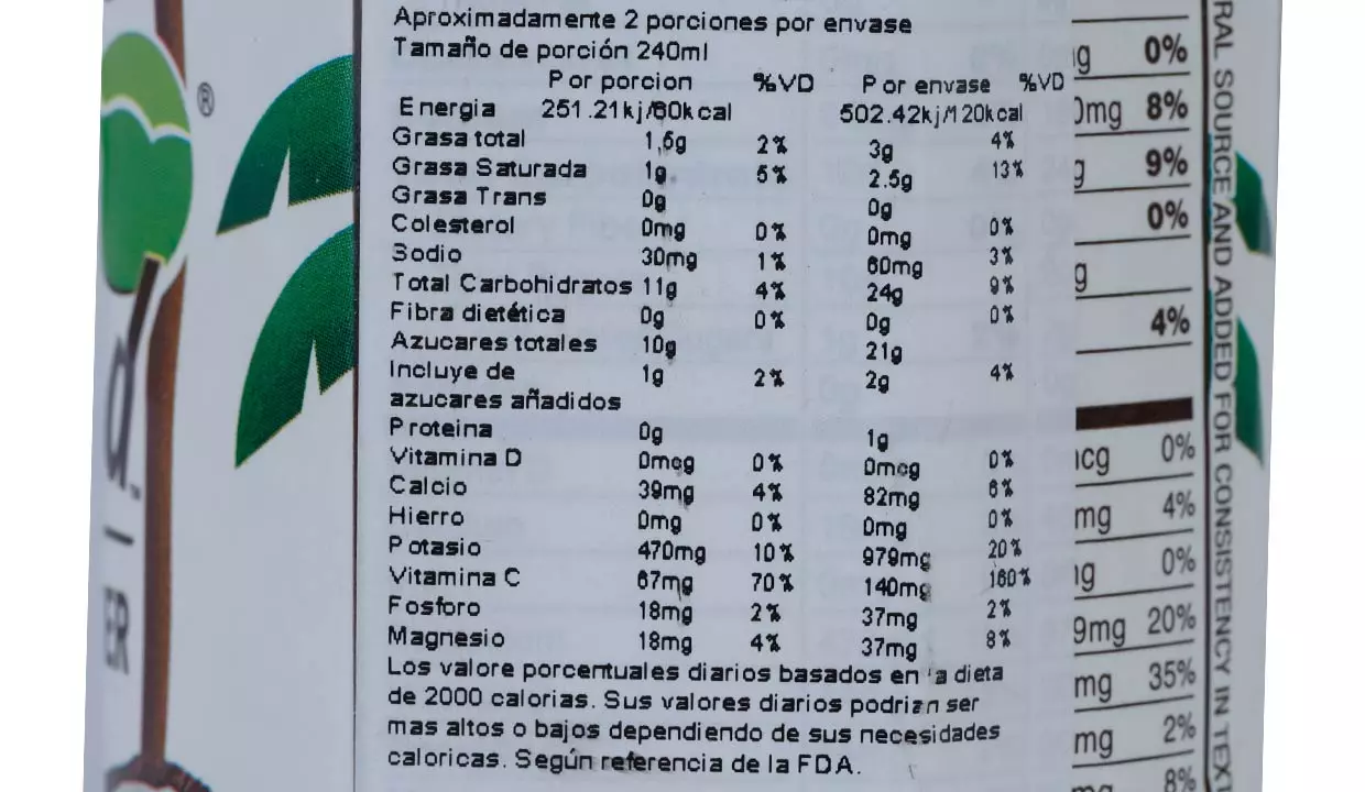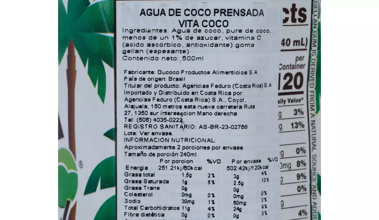| Ingredientes | Agua de coco, puré de coco, menos de 1% de azúcar, vitamina C (ácido ascórbico, antioxidante), goma gellan (espesante) |