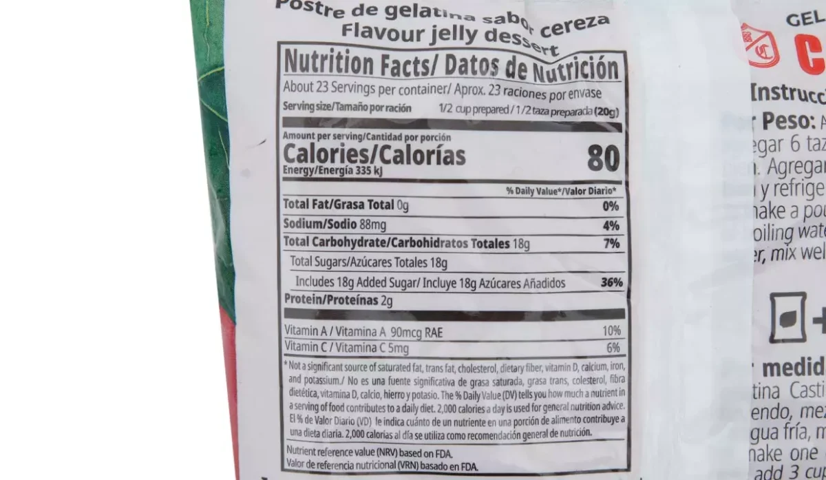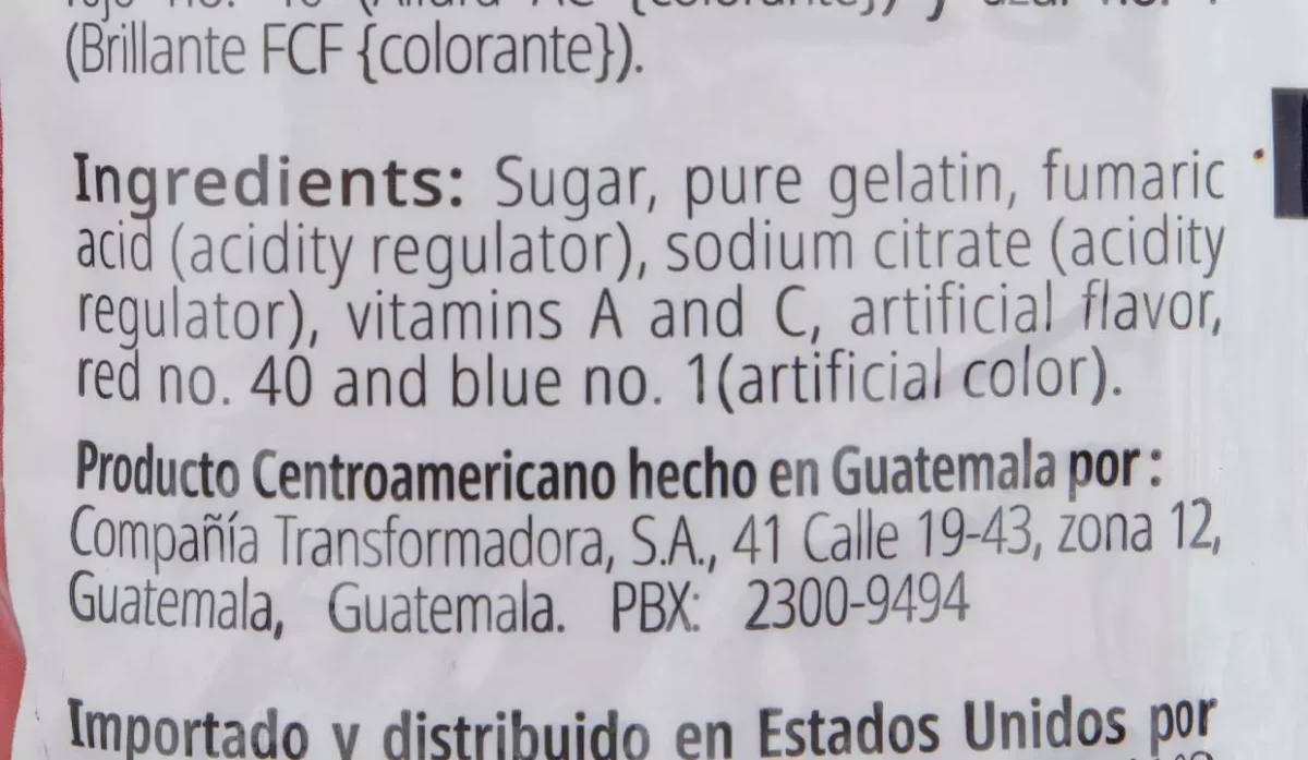 | Ingredientes | Azúcar, gelatina pura, ácido fumárico (regulador de acidez), citrato de sodio (regulador de acidez), vitaminas A y C, sabor artificial rojo No40 (altura) y azul No1 (brillante) |