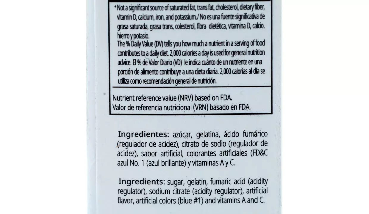Ingredientes | Azúcar, gelatina, ácido fumárico (regulador de acidez), citrato de sodio (regulador de acidez), sabor artificial, colorantes artificiales azul No1 (brillante) y vitaminas A y C |