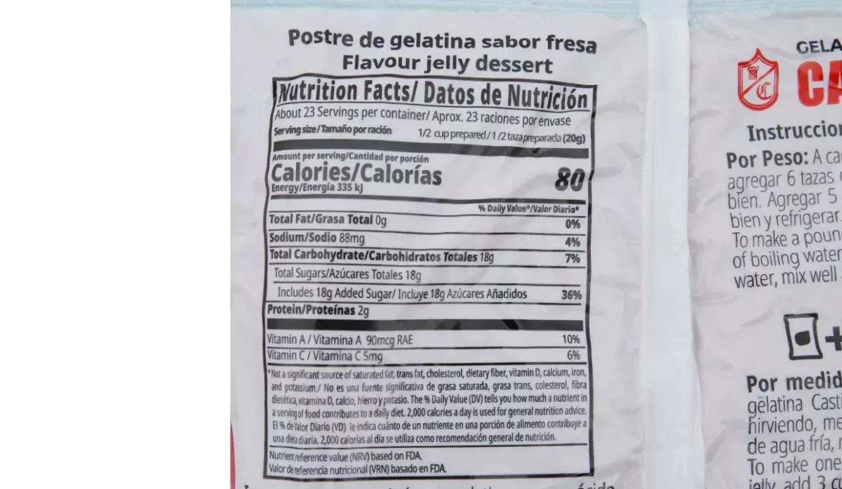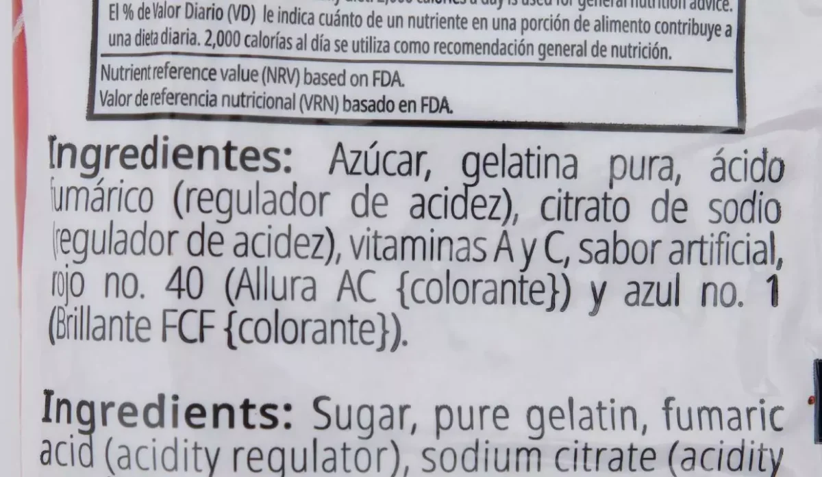 | Ingredientes | Azúcar, gelatina pura, ácido fumárico (regulador de acidez), citrato de sodio (regulador de acidez), vitaminas A y C, sabor artificial rojo No40 (altura) y azul No1 (brillante) |