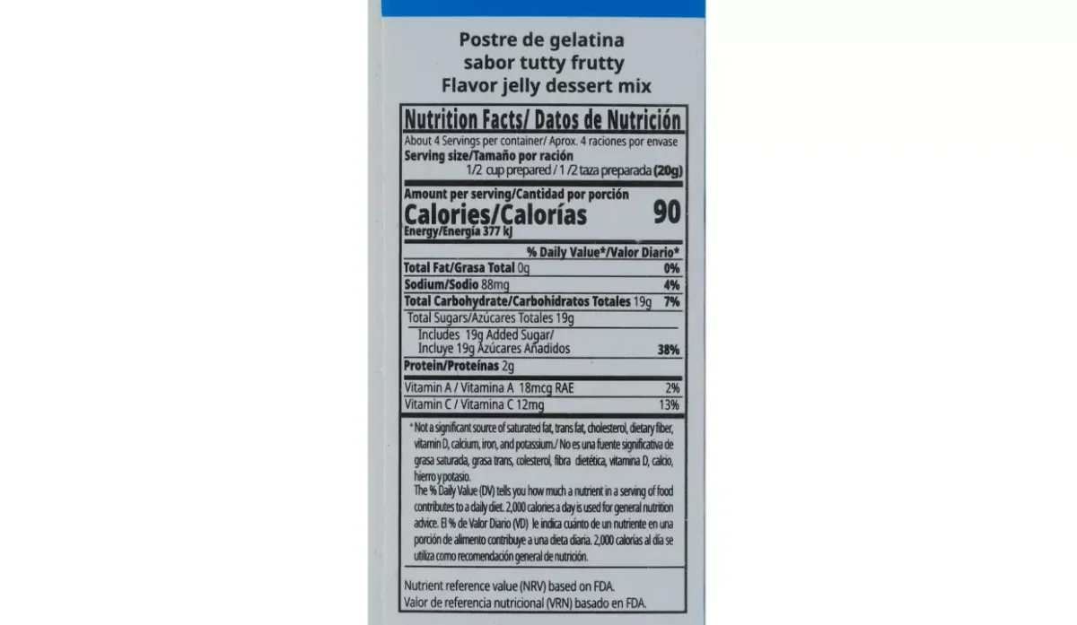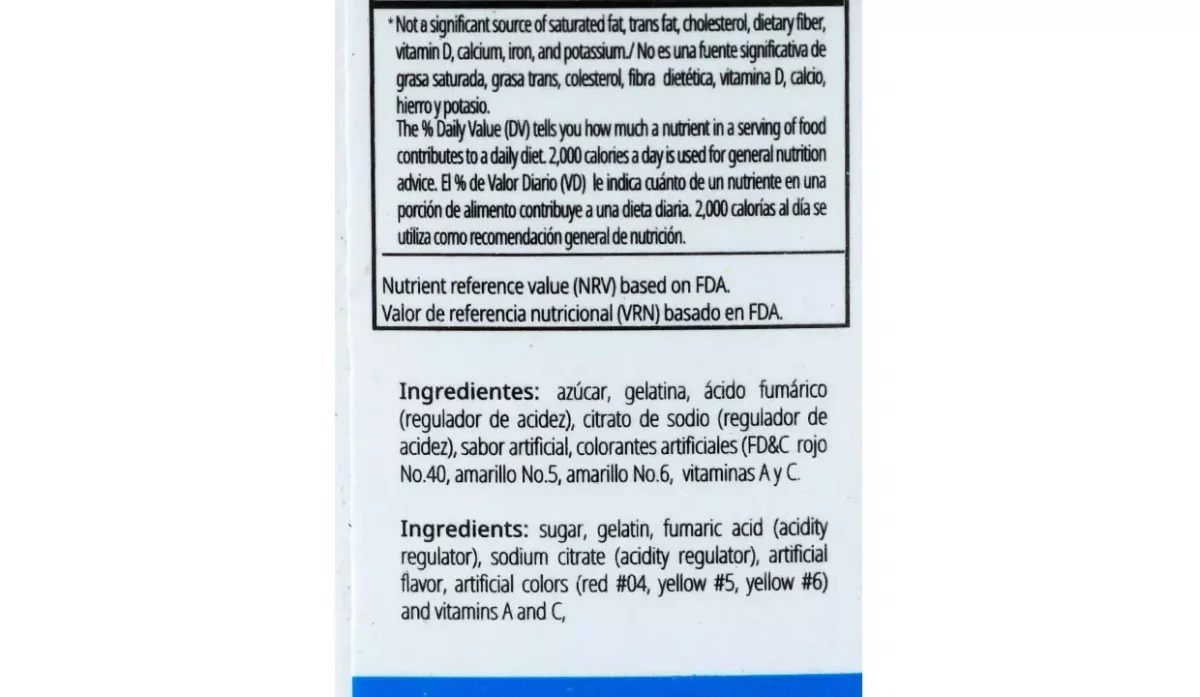 | Ingredientes | Azúcar, gelatina, ácido fumárico (regulador de acidez), citrato de sodio (regulador de acidez), sabor artificial, colorantes artificiales (rojo No40, amarillo No5) y vitaminas A y C |