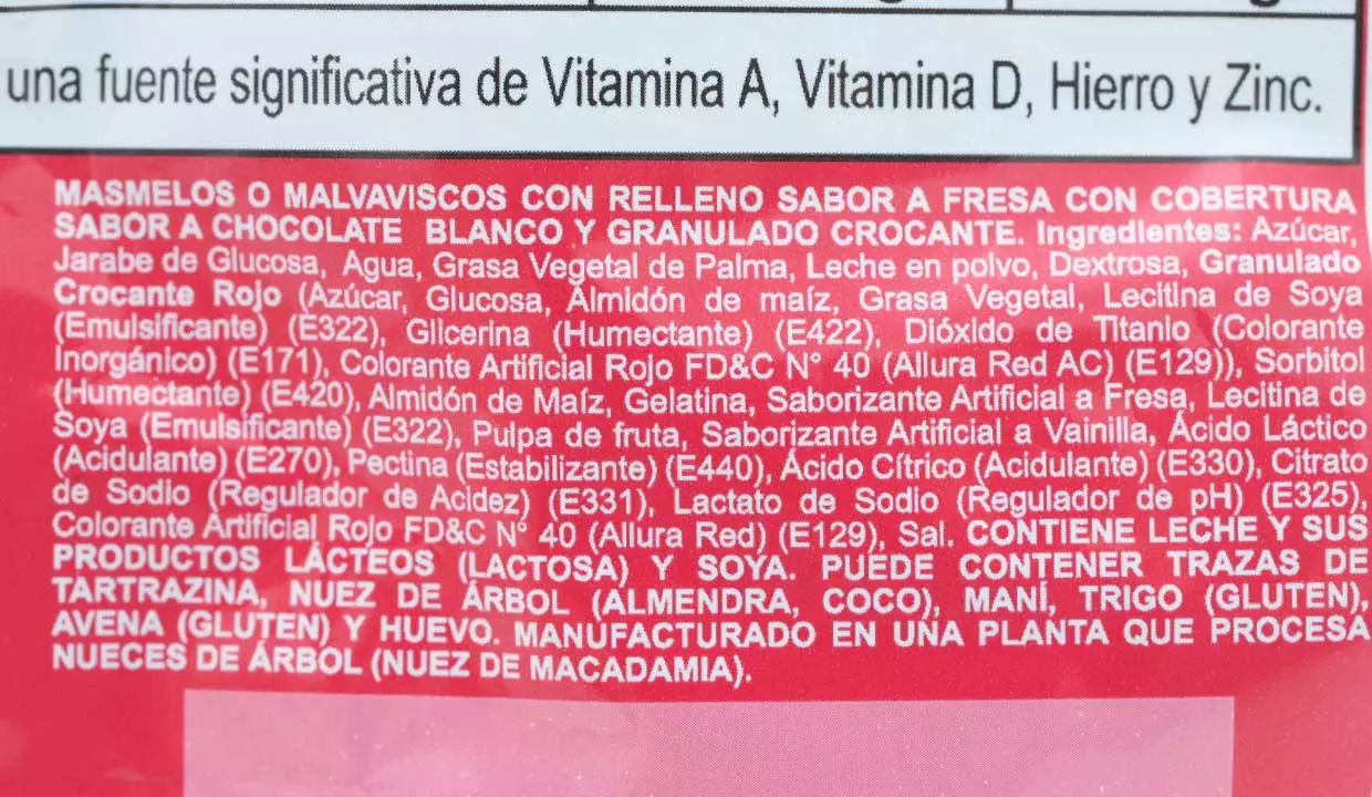 Características | Masmelos con relleno sabor a fresa con cobertura sabor a chocolate blanco y granulado crocante |