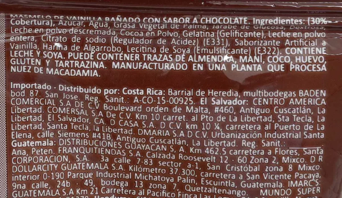 | Características | Masmelo de vainilla bañado con sabor a chocolate |