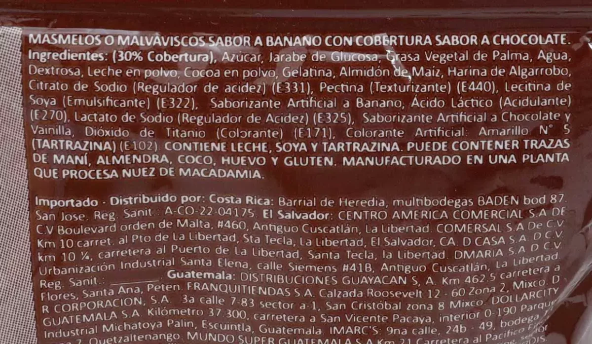 | Características | Masmelos o malvaviscos sabor a banano con cobertura sabor a chocolate |
