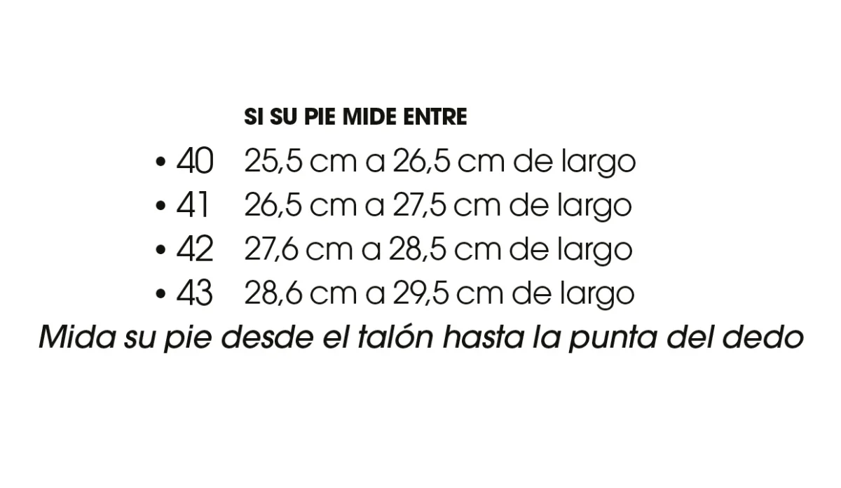 | Tamaño | Si su pie mide entre 25,5 cm a 26,5 cm de largo |
