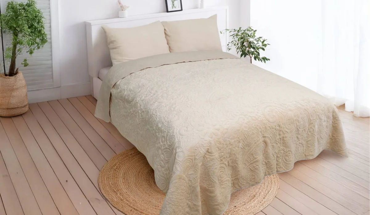 SET DE COLCHA Y FUNDAS BEIGE QUEEN