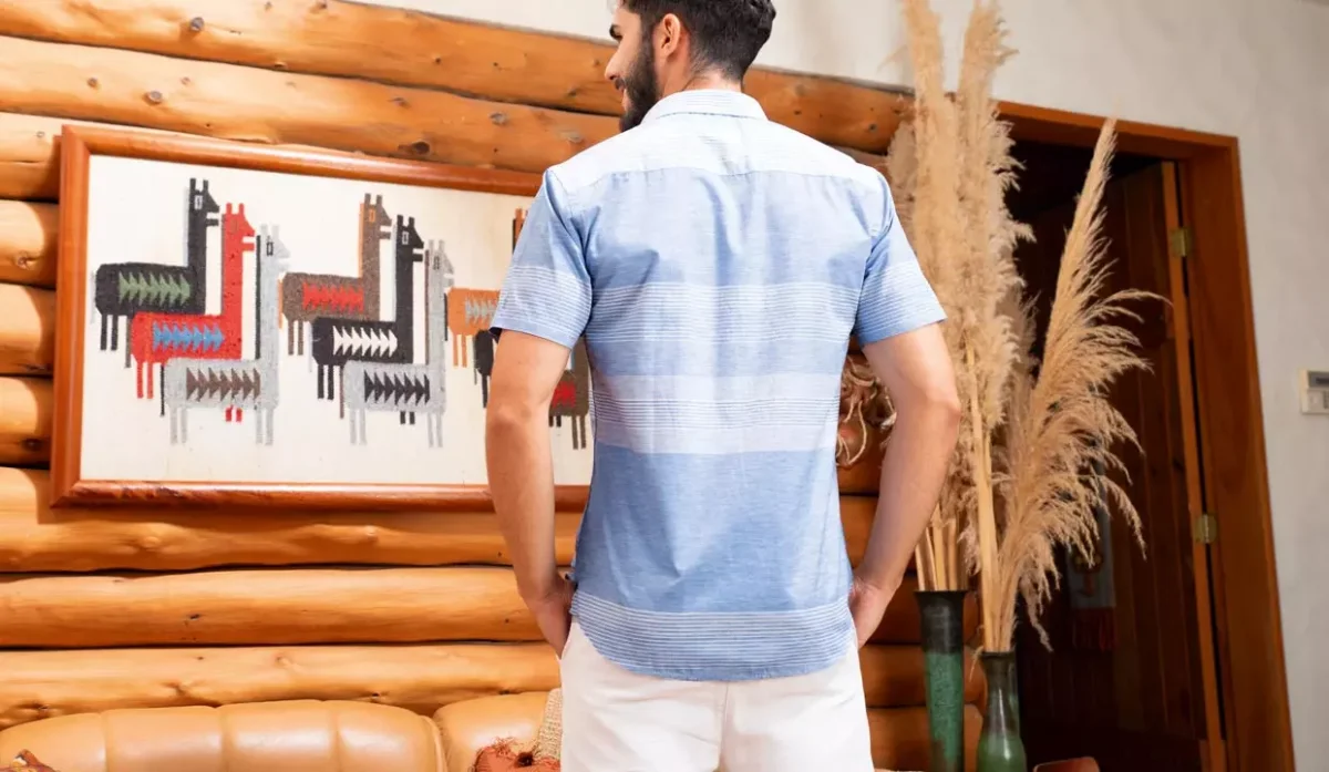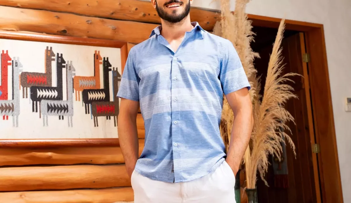 CAMISA SLIM FIT MANGA CORTA CELESTE CON RAYAS T.M