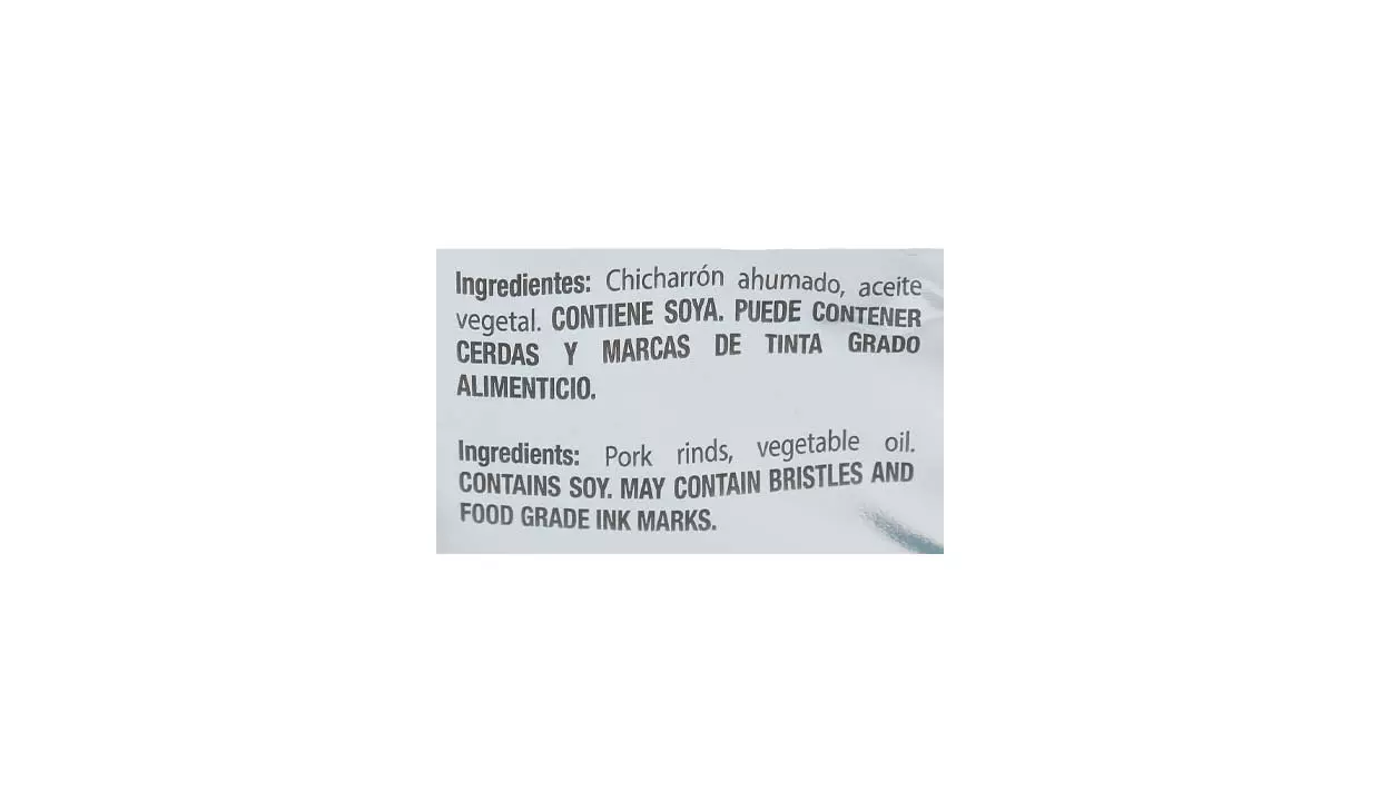 | Ingredientes | Chicharrón ahumado, aceite vegetal y soya |