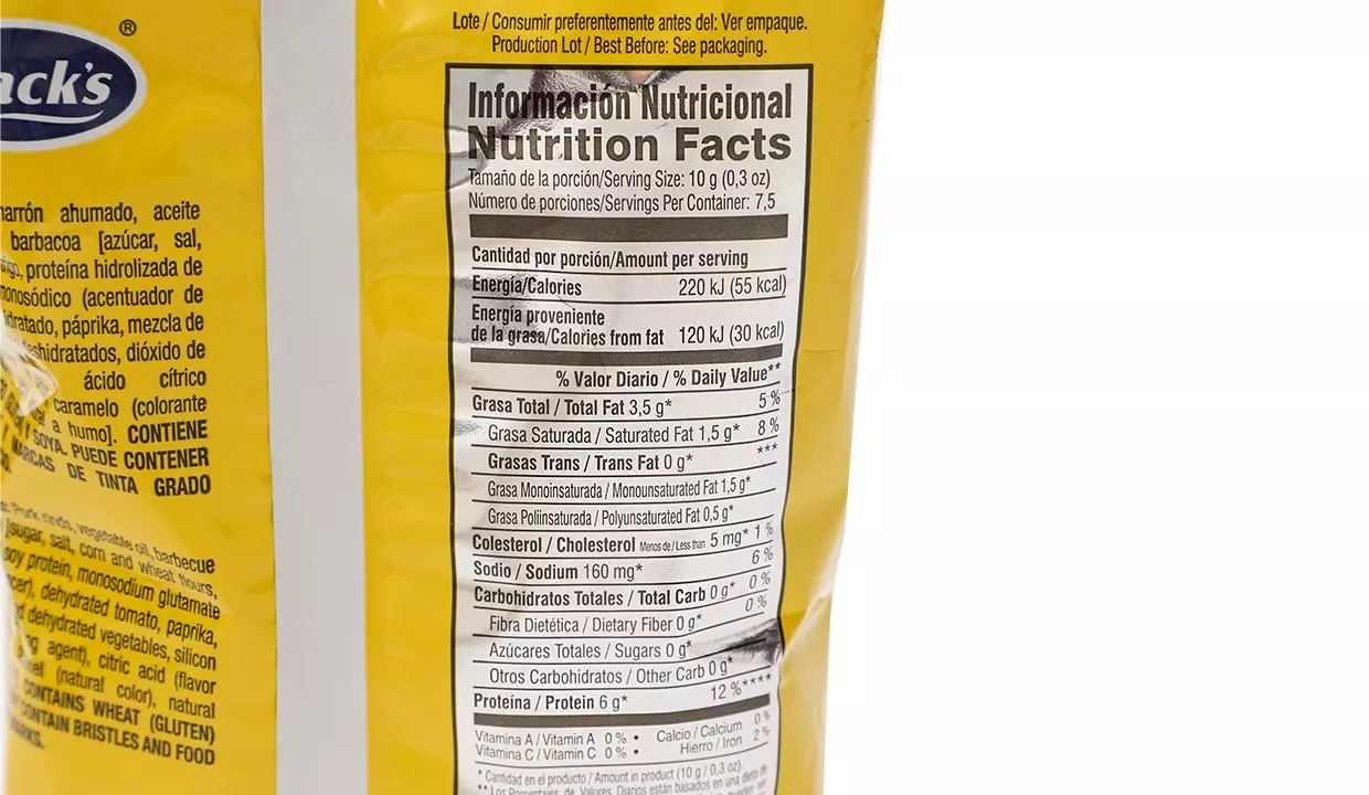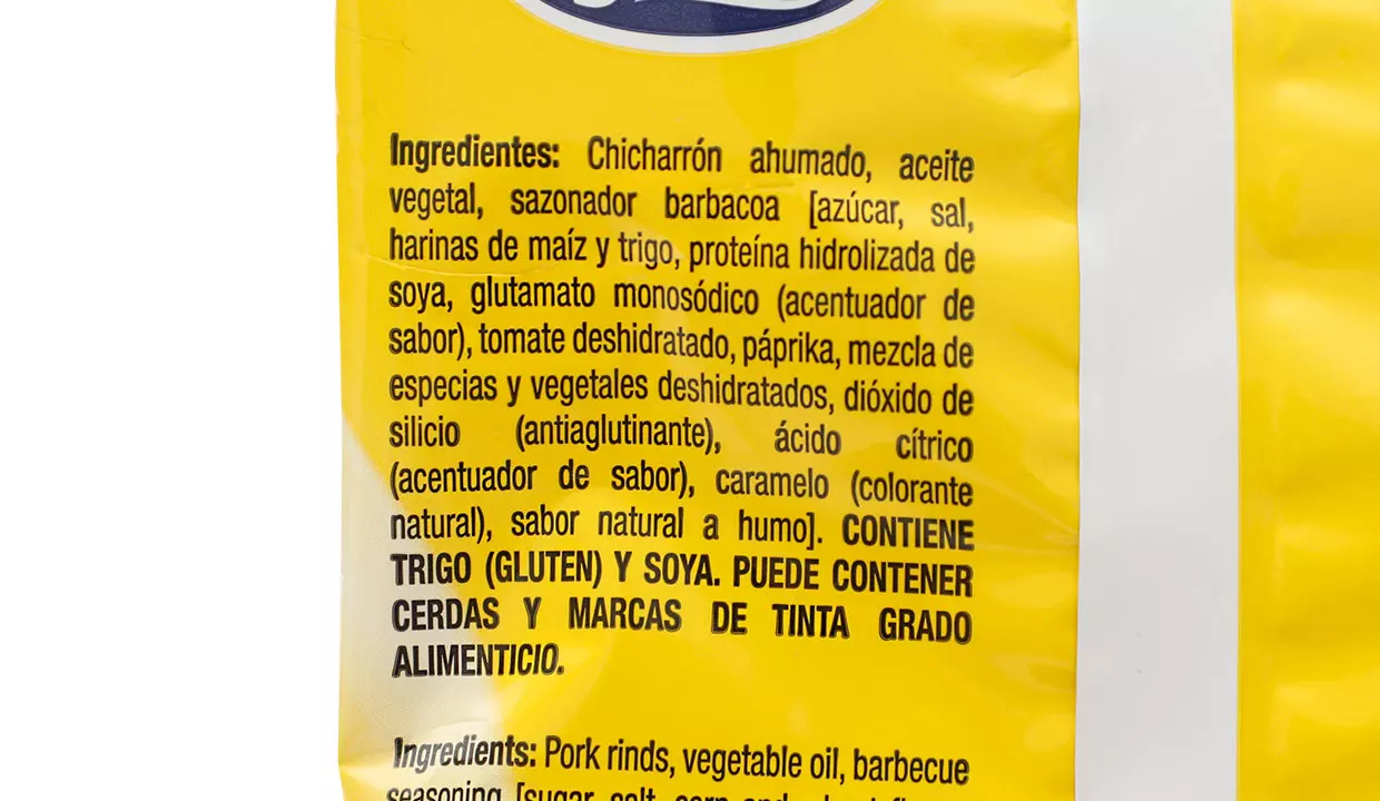 | Ingredientes | Chicharrón ahumado, aceite vegetal, sazonador barbacoa y soya |