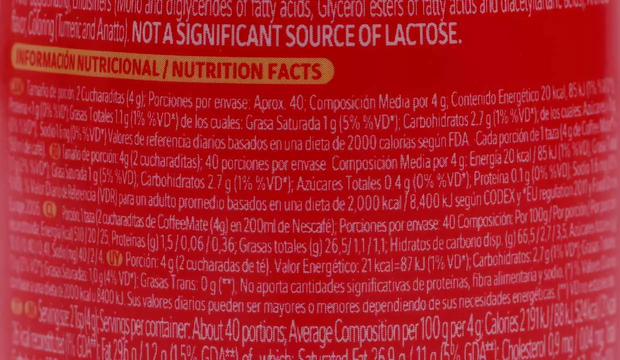 | Ingredientes | Sólidos de maíz, aceite vegetal, caseinato de sodio y derivados de leche |