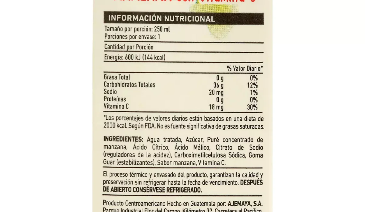 | Ingredientes | Agua tratada, puré concetrado de manzana, azúcar, goma tara y ácido cítrico |