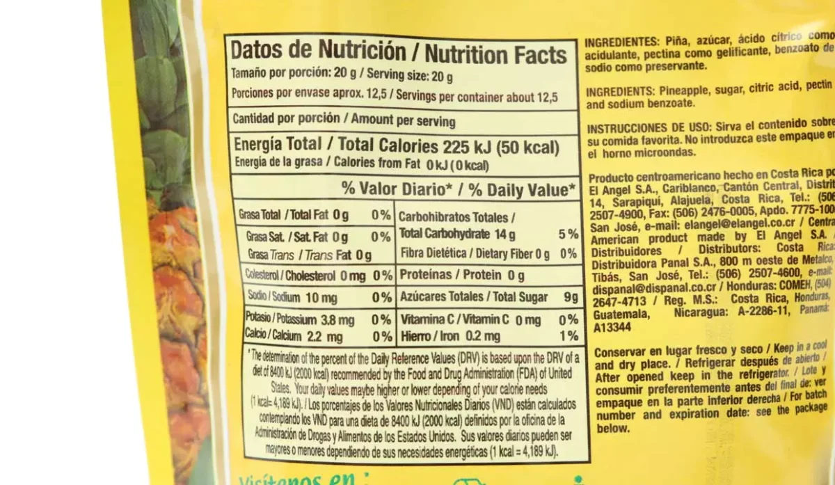 | Ingredientes | Azúcar, piña, ácido cítrico, benzoato de sodio y pectina |